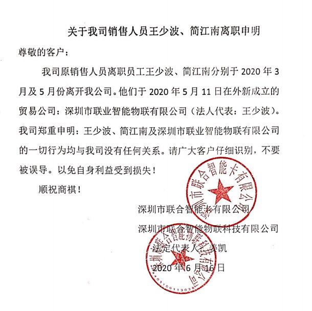 我司鄭重申明:王少波、簡(jiǎn)江南及深圳市聯(lián)業(yè)智能物聯(lián)有限公司的一切行為均與我司沒有任何關(guān)系!