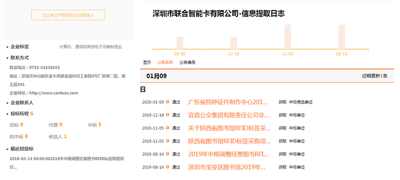 深圳市聯(lián)合智能卡有限公司憑借先進(jìn)生產(chǎn)設(shè)備和資質(zhì)齊全,在2019年~2020年投標(biāo)6個(gè)項(xiàng)目實(shí)際中標(biāo)5個(gè),1個(gè)候選;達(dá)到83%概率,證明深圳市聯(lián)合智能卡有限公司實(shí)力。以下是在投標(biāo)網(wǎng)站顯示聯(lián)合智能投標(biāo)情況: