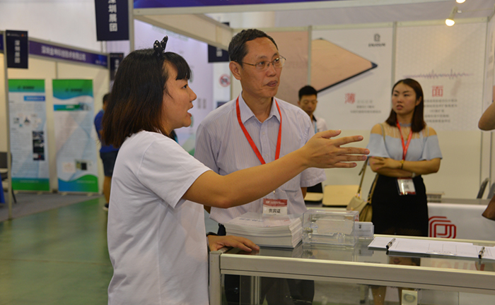 圖為聯(lián)合智能負(fù)責(zé)人為深圳市經(jīng)信委調(diào)研員、管理處處長鄭小珊介紹產(chǎn)品